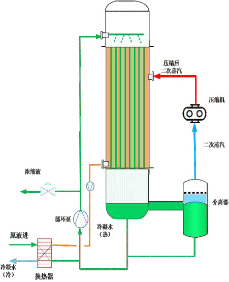 机械式蒸汽再压缩(MVR)蒸发器,其原理是利用高能效蒸汽压缩机压缩蒸发产生的二次蒸汽,把电能转换成热能,提高二次蒸汽的焓,被提高热能的二次蒸汽打入蒸发室进行加热,以达到循环利用二次蒸汽已有的热能,从而可以不需要外部鲜蒸汽,通过蒸发器自循环来实现蒸发浓缩的目的。通过PLC、工业计算机(FA)、组态等形式来控制系统温度、压力、马达转速,保持系统蒸发平衡。