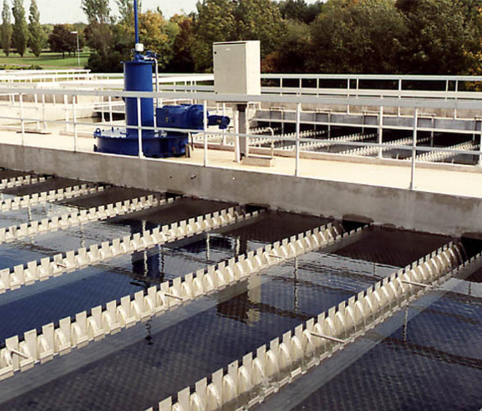 絮凝后出水进入沉淀池的斜板底部然后上向流至上部集水区,颗粒和絮体沉淀在斜板的表面上并在重力作用下下滑。较高的上升流速和斜板60°倾斜可以形成一个连续自刮的过程,使絮体不会积累在斜板上。污泥沿斜板表面下滑并沉淀在沉淀池底部,然后循环泵把部分污泥输送到混凝和絮凝池中,剩余污泥通过重力流流向污泥处理系统。沉淀后的水由分布在斜板沉淀池顶部的不锈钢集水槽收集、排放。
