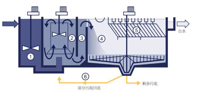 混凝剂投加在原水中,在快速搅拌器的作用下同污水中悬浮物快速混合,通过中和颗粒表面的负电荷使颗粒“脱稳”,形成小的絮体然后进入絮凝池。同时原水中的磷和混凝剂反应形成磷酸盐达到化学除磷的目的。回流的污泥和混凝形成的小絮体在快速搅拌器的作用快速混合,并以污泥为核心形成密度更大、更重的絮体。以利于在沉淀池中的快速沉淀。