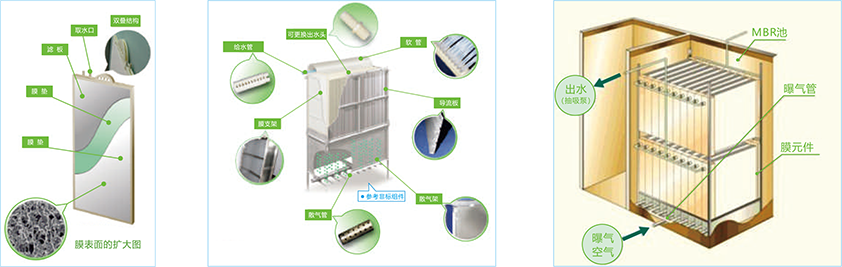 膜生物反应器技术(Membrane Bio-Reactor)是膜分离技术和污水生物处理技术有机结合的产物,该技术的特点是以超、微滤膜分离过程取代传统活性污泥处理中的泥水重力分离过程。由于膜可全面截留微生物,大大提高了生物反应器中的生物浓度和种群数量,使得生物降解效率明显提高。