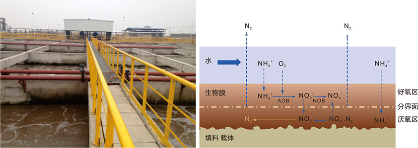 在好氧MBBR体系中,填料通过底部的曝气作用和水流的提升作用而处于流化态,填料在移动过程中切割分散气泡并进一步使布气趋于均匀,增加了氧气的利用率,极大提高了微生物、溶解氧和污染物三者间的传质效率。填料上的微生物处于气、液、固三相环境下生长。当填料表面的生物膜增加较厚时,老化的生物膜将会在水流和气流的冲刷作用下而自然脱落,随水流冲走,使填料表面的生物膜不断更新,始终保持较高的活性。此外,受传质速率梯度变化影响,生物膜随厚度变化形成好氧-缺氧-厌氧共存的特殊溶氧环境,有利于水解及反硝化反应进行,处理系统将表现出更强的处理深度与抗冲击能力。