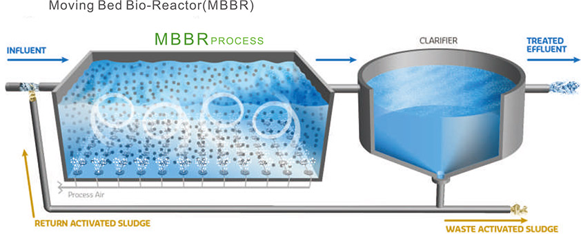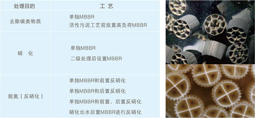 移动床生物膜反应器(Moving Bed Bio-Reactor,MBBR)是一种新型的生物膜处理技术,其通过向反应器中投加一定数量比重接近于水且比表面积大的悬浮填料,以此作为微生物附着生长的载体;在水力作用下生物膜悬浮载体随水流的提升作用而在反应器中移动,与污水混合均匀;污水连续进入反应器,大量生长在悬浮填料上的微生物对污水中的污染物进行吸附、同化或异化降解,从而达到净化污水的目的。