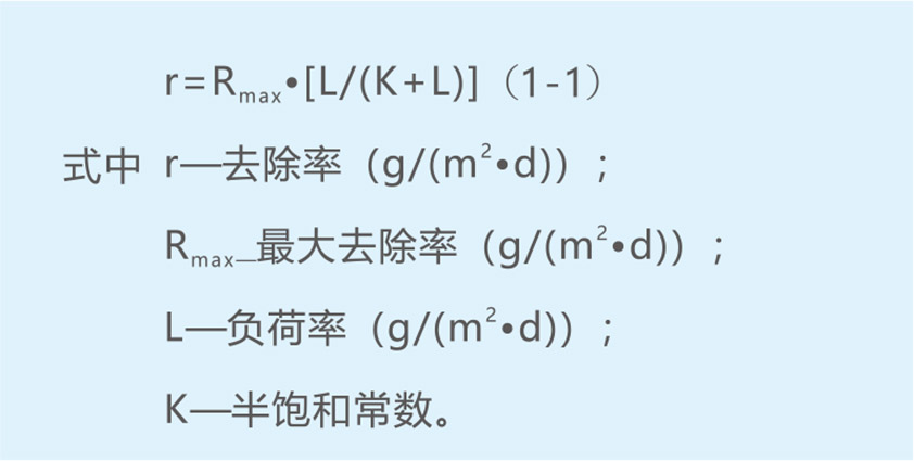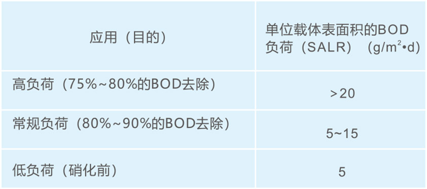 对移动床反应器而言,有效生物膜净面积是关键的设计参数,而负荷和反应速率可表示为载体表面积的函数,因此载体表面积就成为表达MBBR性能的常用和方便的参数。MBBR的负荷常表示为载体表面积去除率(SAAR)或载体表面积负荷(SALR)。当主体基质浓度较低(比如S>>K)时,MBBR的基质去除率为零级反应。当主体基质浓度较低(比如S< 碳类物质的去除 去除碳类物质所需的载体表面积负荷(SALR)取决于其最重要的处理目的和泥水分离方法。表1-2给出了常用的针对不同应用目的的BOD负荷范围。当下游为硝化时,应采用较低的负荷值。只有当仅考虑碳类物质去除时才可采用高负荷。经验表明,对于碳类物质的去除,主体液相中的溶解氧为2~3mg/L是足够的,再增加溶解氧浓度对提高载体表面积去除率(SARR)并无意义。 表1-2 典型的BOD符合值