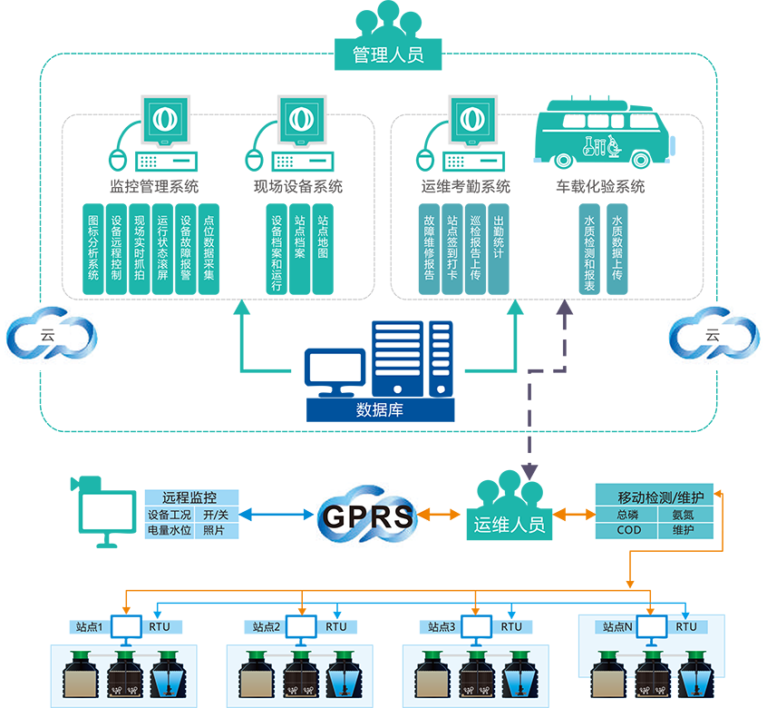 站点中控RTU为自动远程数据采集及控制终端,以运维人员携带的智能手机上的APP应用为人工数据采集终端,形成远程监控管理、现场设备管理、运维考勤管理和水质分析信息系统管理四大功能。实现人、设备和数据的无缝对接。完全实现智能化管理,无需专人值守。