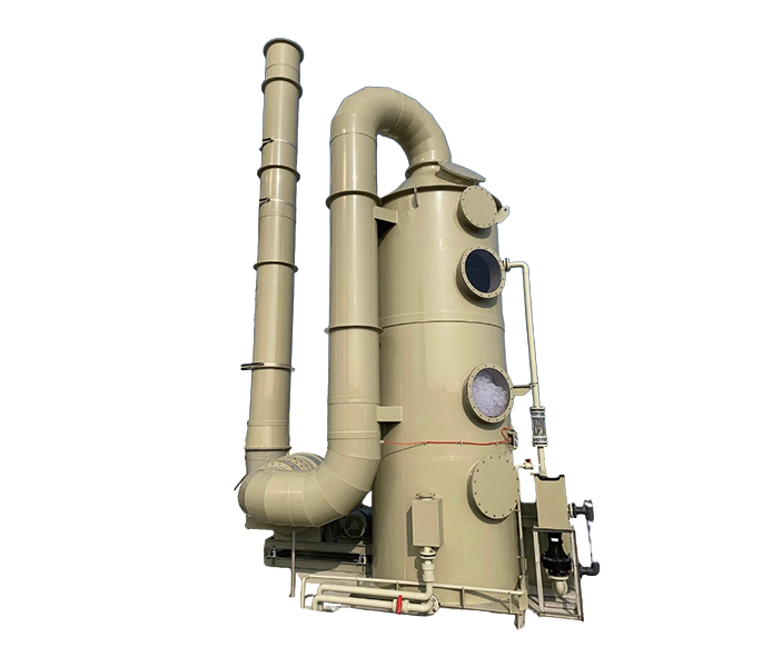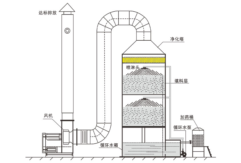 工业废气由风管引入喷淋塔,经过填料层,废气与吸收液进行气液两相充分接触吸收中和反应,废气经过净化后,再经除雾板脱水除雾后由风机排入大气。吸收液在塔底经水泵增压后在塔项喷淋而下,最后回流至塔底循环使用。